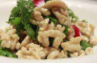 核桃仁中的磷脂,对脑神经有良好保健作用。核桃油含有不饱和脂肪酸,有防治动脉硬化的功效。核桃仁中含有锌、锰、铬等人体不可缺少的微量元素。可健胃、补血、养神、润肤黑发。但美中不足的是,核桃仁中油脂含量高,吃多不好消化。不过醋可以健胃消食、去油腻,还能解毒,所以两者结合后效果更好,因此醋泡核桃仁倒是一道很不错的美食,可做开胃小菜。