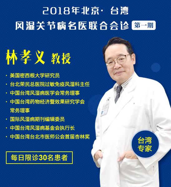 此时正值初春3月,早晚气温变化较大,致病因子活跃,风湿关节病处于高发期,为了让民众从学术盛会得到实实在在的临床 机会,针对类风湿关节炎、痛风性关节炎、强直性关节炎、颈肩腰腿痛等风湿关节病病情久治不愈、反复发作的患者,会议结束后,美国密西根大学研究员、台北荣民总医院过敏免疫风湿科主任林孝义教授将携手我院风湿免疫科主任王怀庆等多位专家展开联合会诊,为患者提供多对一的专家联合会诊以及精准化病房巡诊,让患者享受到本次学术盛会带来的更全面、更针对性的个体化科学诊疗方案。