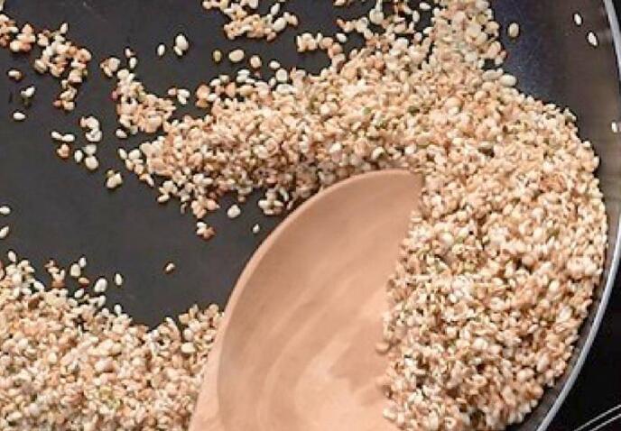Step1.将大麻籽及白芝麻用白锅慢火炒至金黄色。