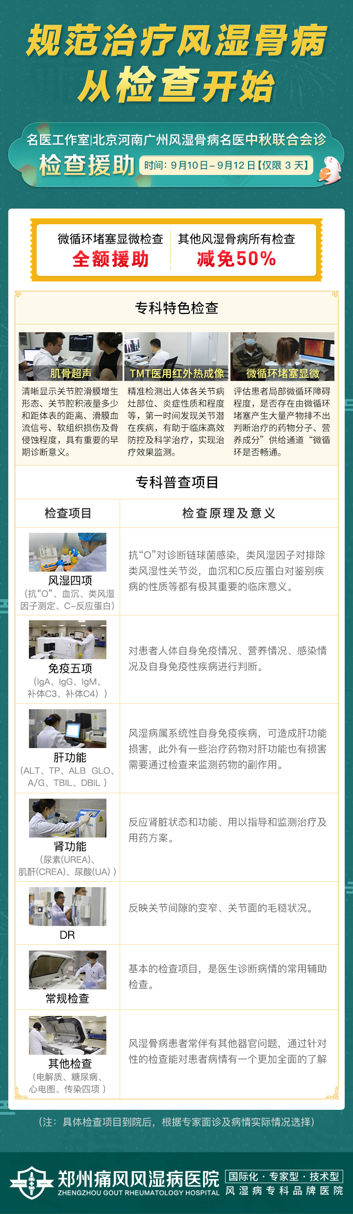 “治标不治本”是导致痛风风湿病患者久治不愈、反反复复的重要原因,患者往往存在“不痛不治、只止疼不治病、不听从医嘱”的诊治误区,加上很多地区缺乏对痛风风湿病完善的诊治条件,在未明确病情的情况下就盲目治疗,而传统单一的药物治疗、局部理疗等不能清除关节深层炎症,最终导致很多痛风风湿病患者出现“疼痛反复、用药无效、病情加重错失治疗关键期”等问题,为此,河南省医学科普学会风湿医学科普基地、亚太痛风联盟HGMC郑州分中心——郑州痛风风湿病医院,于2022年9月10日-12日,开展“名医工作室|北京河南痛风风湿病名医面对面中秋联合会诊(限额报名)”活动。本次,首都医科大学附属北京友谊医院陈乐天教授,河南中医药大学第一附属医院王济华教授,北京医院刘爱华主任,原广州军区总院陈志煌主任,郑州痛风风湿病医院杜爱华、程本维、徐学成、郑家琛、朱文浩、陈会想、康秀宣等知名医师将开展多学科联合会诊,旨在帮助广大痛风风湿骨病患者明确检查,规范治疗,早日摆脱病痛困扰,回归正常生活。 、